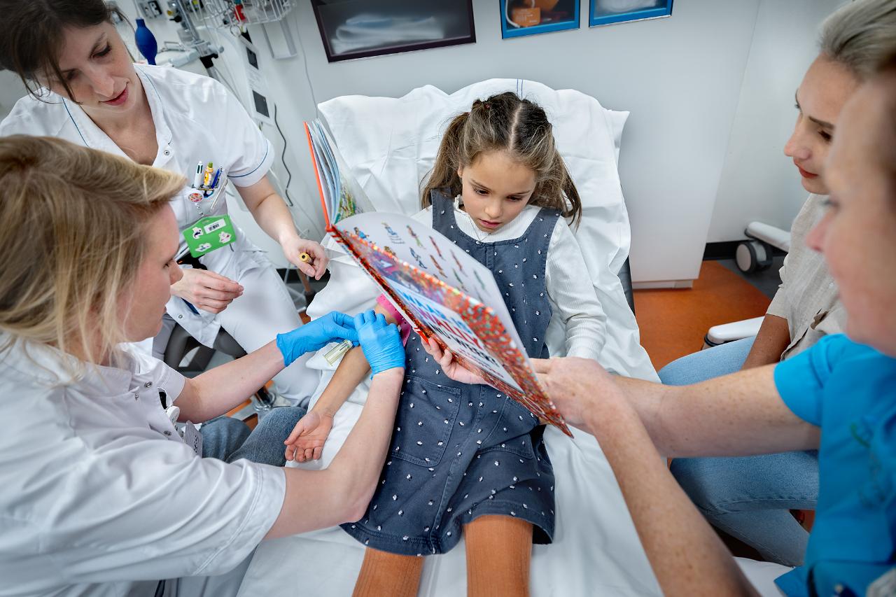 Als afleiding niet genoeg helpt, kan een mild angstverlagend middel worden gegeven (midazolam) – zonder nare herinneringen of ‘chemische dwang’. Op de poli wordt gewerkt volgens de principes van procedurele comfortzorg (PROSA):
